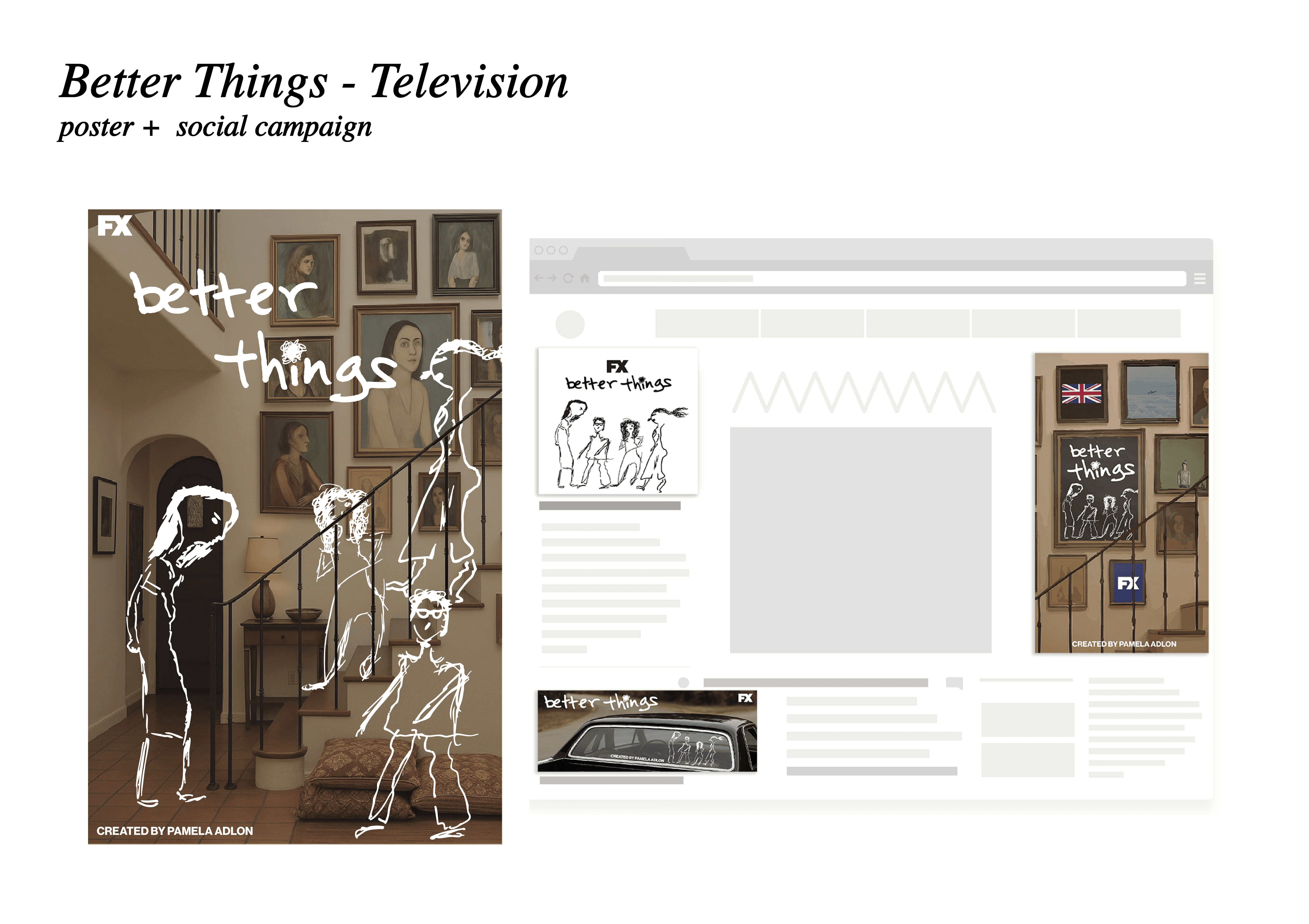 INSPIRED BY POLITICAL ARTIST: ARDESHIR MOHASSES; THIS CAMPAIGN IS FOR THE FINAL SEASON OF THE SHOW BETTER THINGS. IT CONTAINS A CLASSIC SHOW POSTER AND IS ACCOMPANIED BY 3 WEB/SOCIAL ADS. THE CAMPAIGN IS CENTERED AROUND THE MAIN PLOT POINT OF THE FINAL SEASON AND THE DYNAMICS OF THE FAMILY.