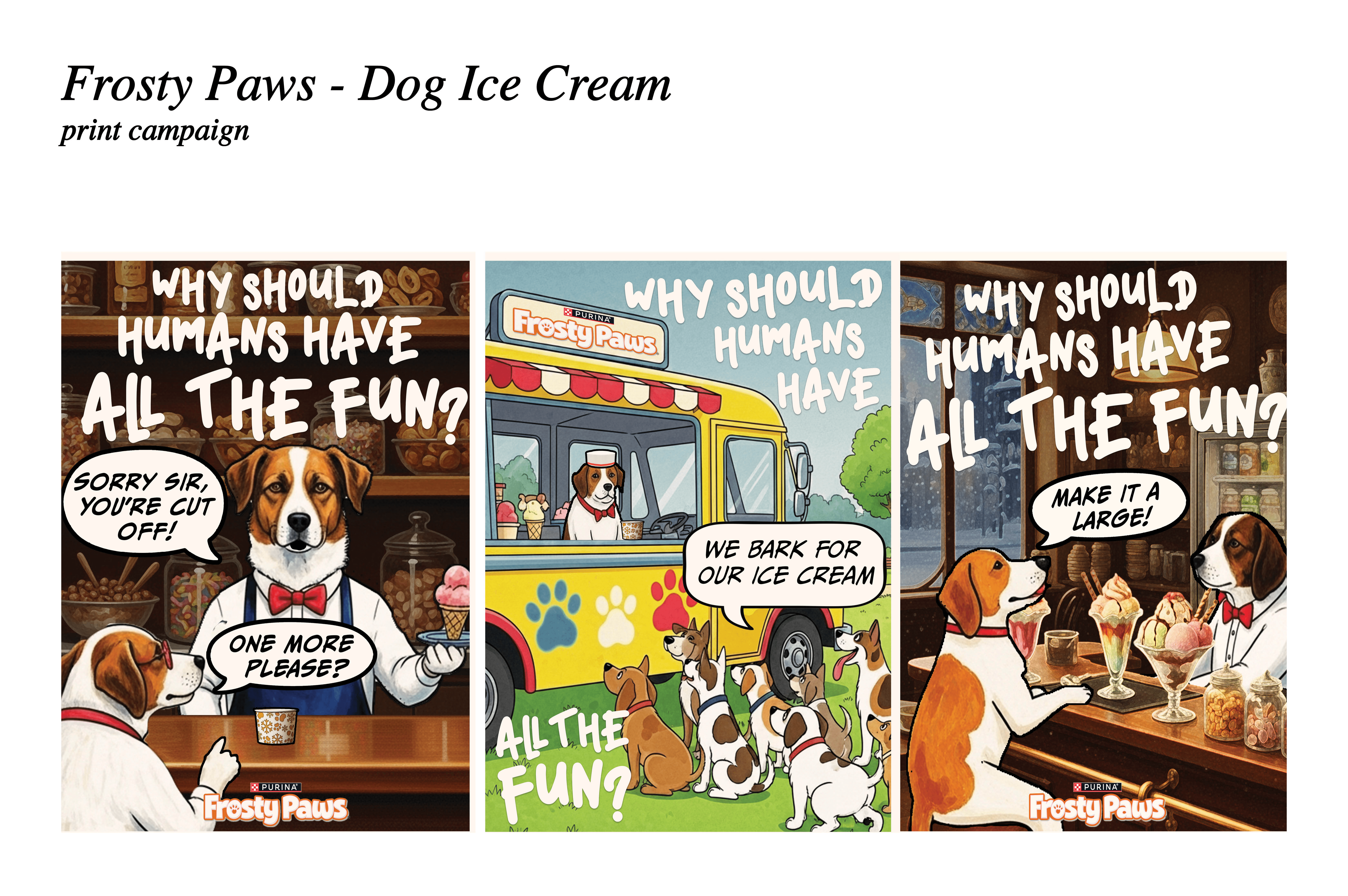 FOR THIS CAMPAIGN WE HAD TWO MAIN INSPIRATIONS: A DOG BEING A PERSON'S BEST FRIEND, AND THE INFAMOUS DOGS PLAYING POKER PAINTING. WE CAME UP WITH "WHY SHOULD HUMANS HAVE ALL THE FUN?" PLAYING WITH THE CONCEPT OF DOGS DOING HUMAN ACTIVITIES.