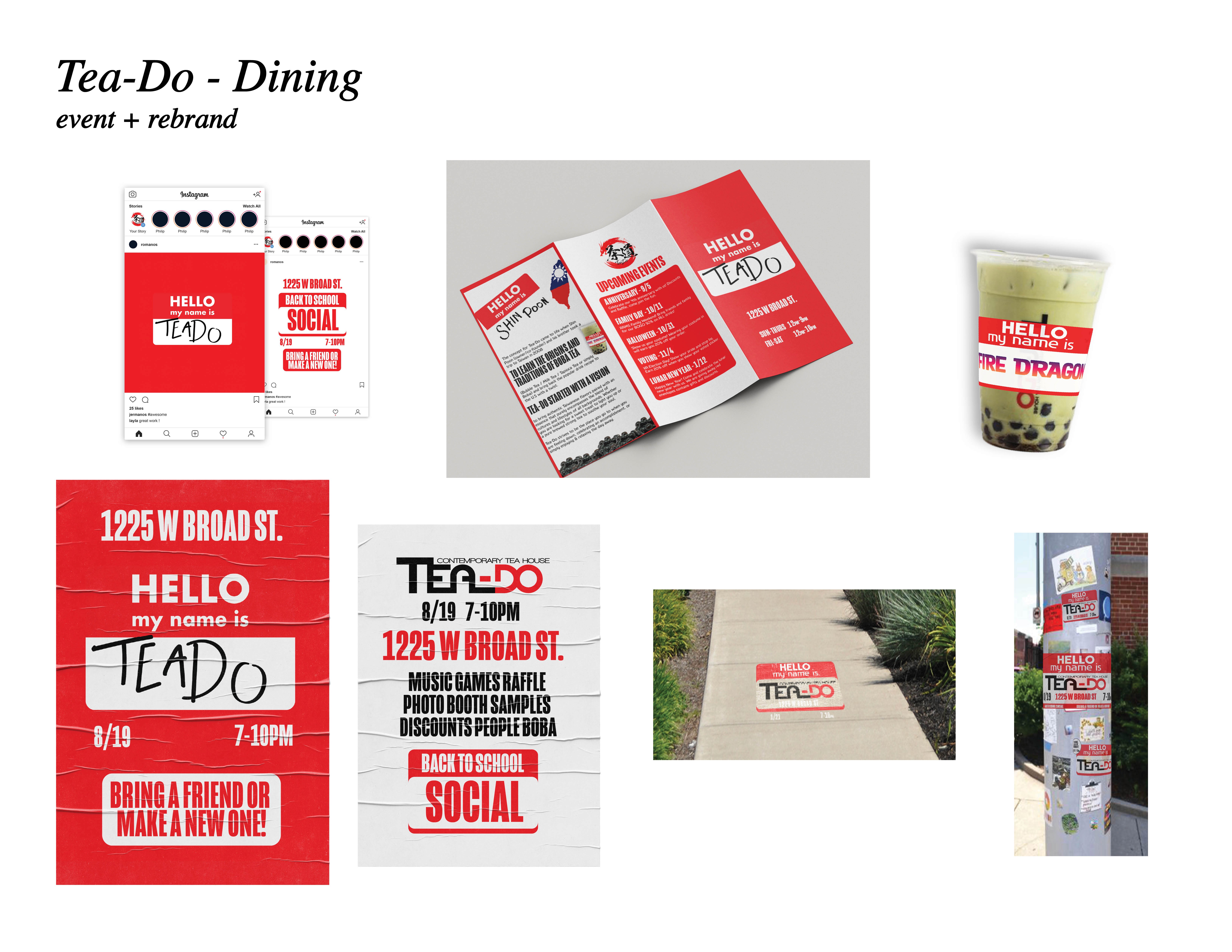 THE “HELLO, MY NAME IS:TEADO” CAMPAIGN WOULD START OFF BY UPDATING TEADO’S RELATIVELY OUTDATED BRANDING AND WEBSITE(S). BECAUSE TEADO IS LOCATED MOSTLY ON COLLEGE CAMPUSES, THE CAMPAIGN WOULD CONTINUE BY ORGANIZING SOCIAL ACTIVITIES AND MEETINGS TO INTRODUCE COLLEGE STUDENTS WHO ARE NEW TO THE AREA OR SIMPLY MEETING NEW PEOPLE TO EACH OTHER. LASTLY, THE CAMPAIGN WOULD ALSO GIVE PEOPLE THE OPPORTUNITY TO “MEET” THE OWNER SHIN POON, WHO IS USUALLY HIDDEN.